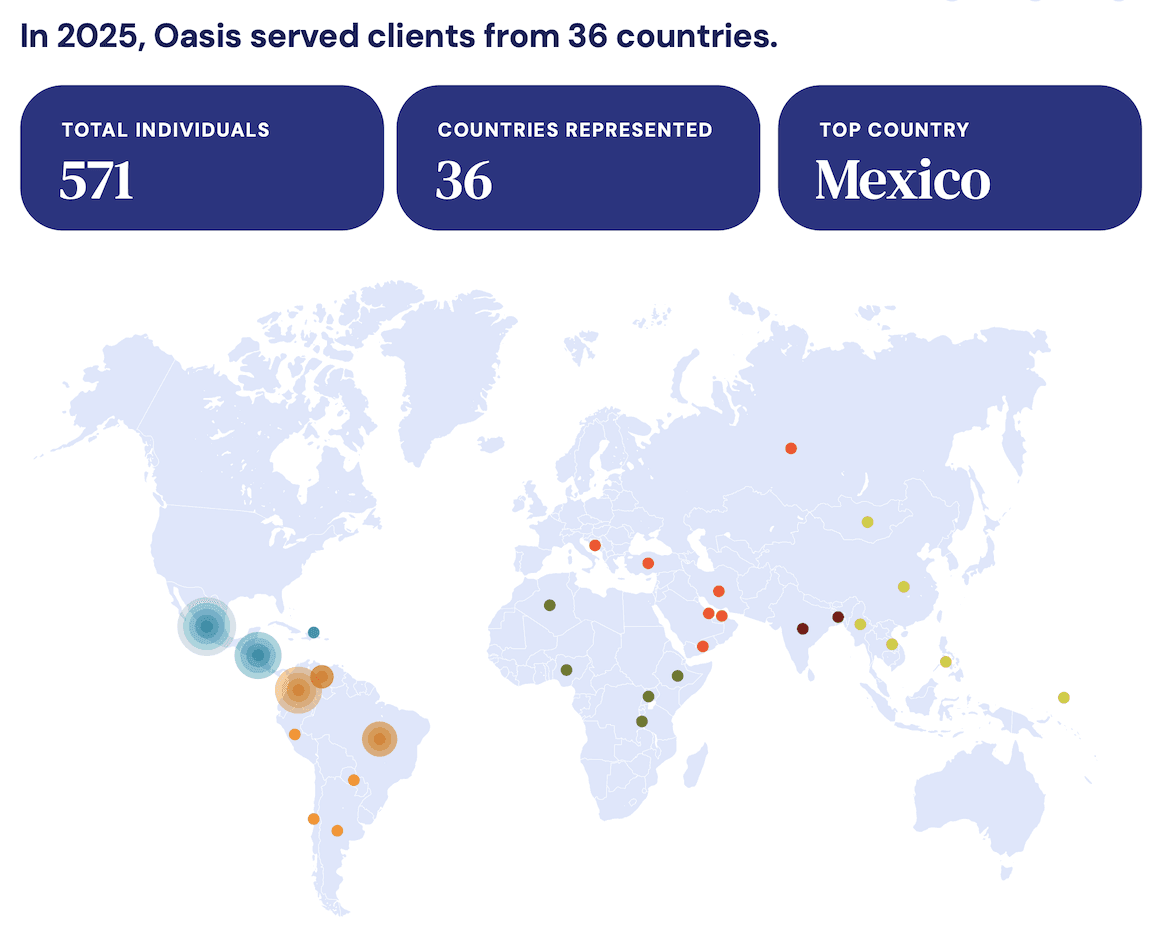 Last year, we stood by individuals and families navigating some of their lives' most challenging moments. 2025 was a tough and often heartbreaking year in immigration work, but we also saw extraordinary commitment and care from our partners and supporters. We are proud to share Oasis Legal Services’ 2025 Impact Report and reflect on what we have been able to do together. The report highlights the milestones we have reached, the resilience of our clients, and the ongoing work of our team to provide life-changing services to LGBTQ+ immigrants.