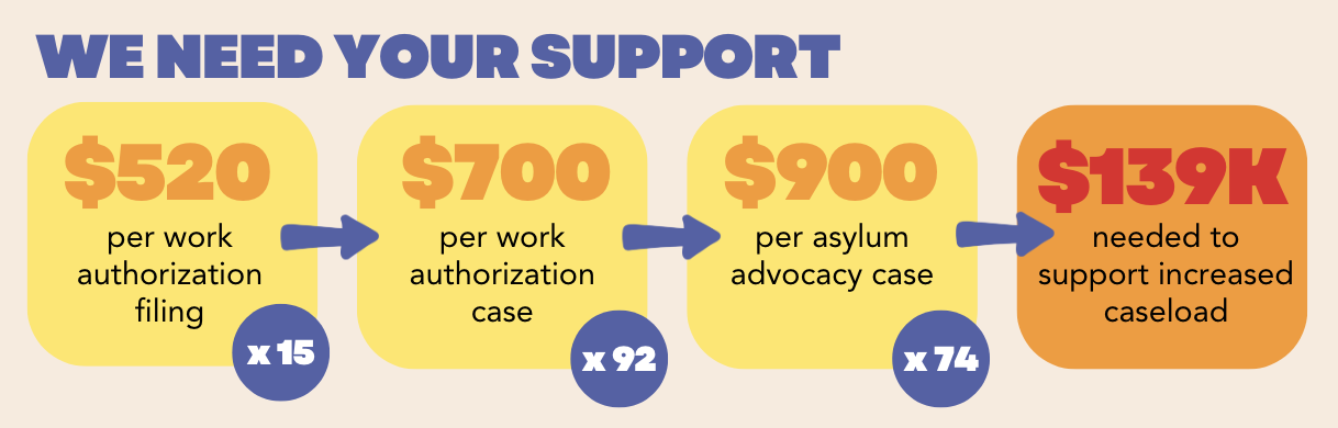 La cantidad de trabajo que nuestro equipo está realizando en unas pocas semanas normalmente tomaría un año completo para completarse. Hacemos esto por nuestra comunidad y para proteger a la mayor cantidad posible de inmigrantes LGBTQ+ de la posible deportación y el daño. Por favor, considera cualquier apoyo financiero que puedas ofrecer y comparte nuestra campaña con cualquier persona que pueda apoyar nuestros esfuerzos.